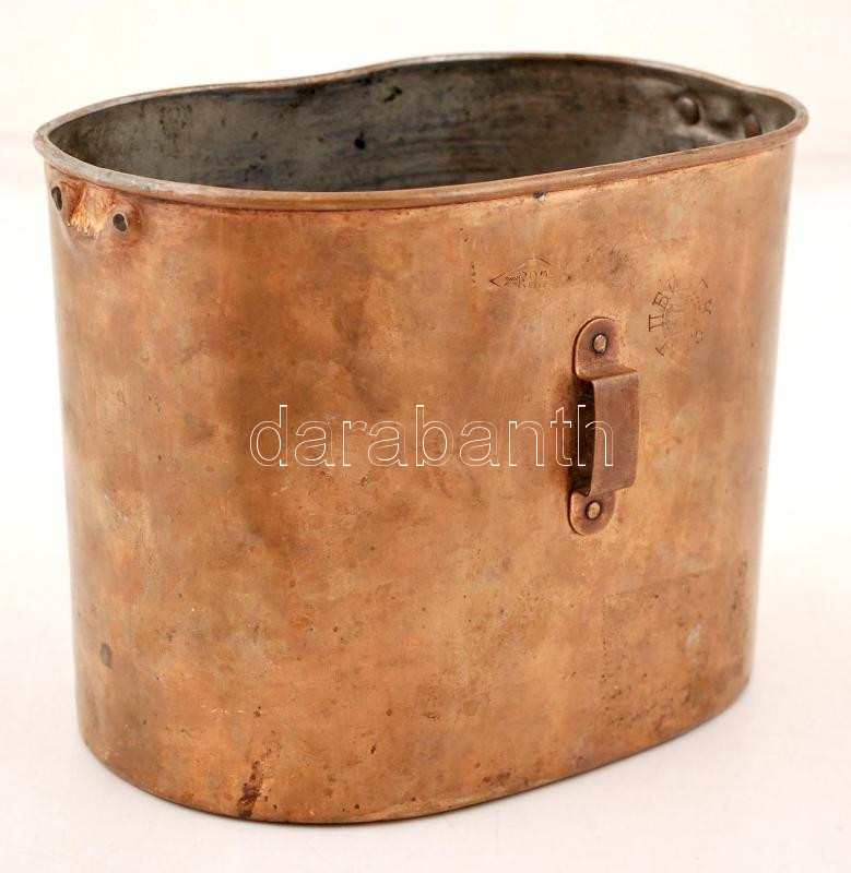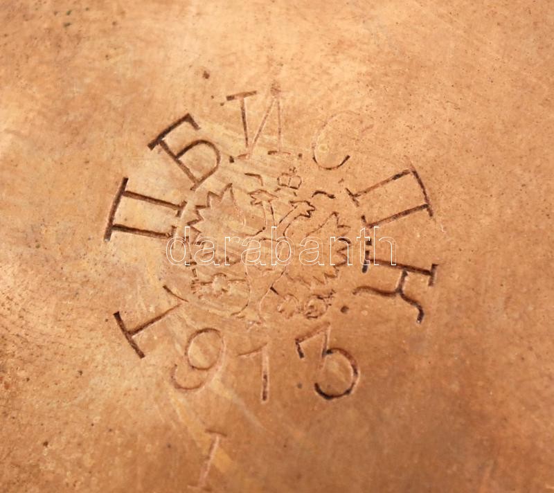 1913 Orosz réz csajka, fedele hiányzik, jelzett, 17,5×11×13,5 cm https://www.darabanth.com/hu/254-Gyorsarveres/254.0/Festmeny-mutargy-papirregiseg-egyeb/Militaria~400006/1913-Orosz-rez-csajka-fedele-hianyzik-jelzett-17-5C39711C39713-5-cm~II1233932