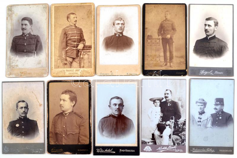 cca 1900-1914 10 db különféle keményhátú katonai fotó, egy részük hátulján feliratozva, különféle műtermekből (Nagyszeben, Nagykanizsa, Arad, Budapest, Kolozsvár, stb.)