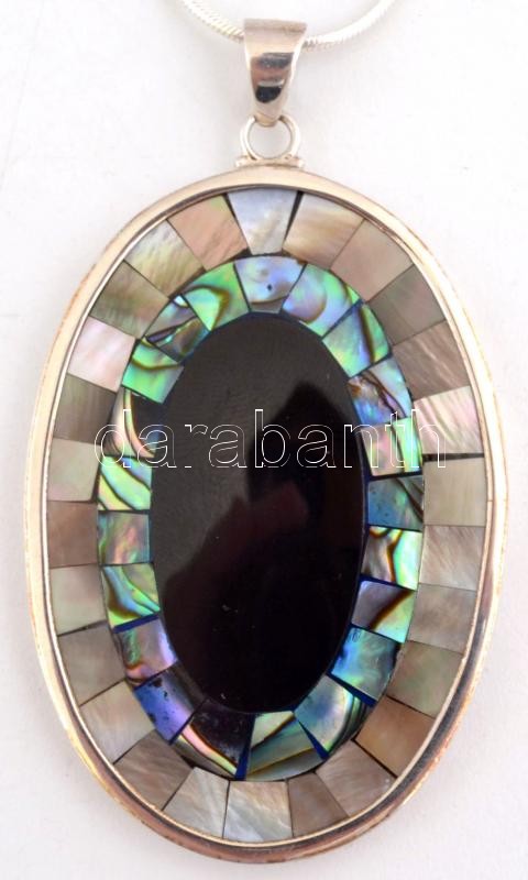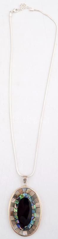 Leírás: Ezüst(Ag) lánc ezüstbe foglalt kagylómozaik függővel, jelzett, h: 42 cm, br: 18,3 g