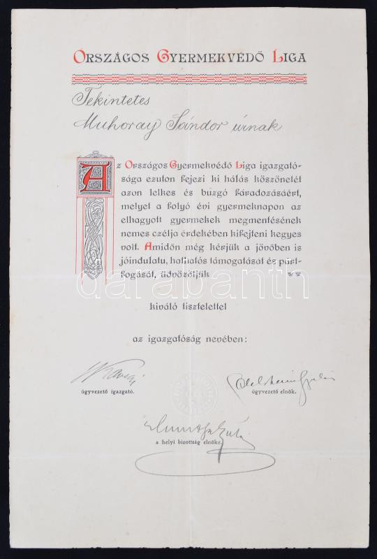 cca 1910 Az Országos Gyermekvédő Liga által lelkes gyermekvédő munkáér... https://www.darabanth.com/hu/254-Gyorsarveres/254.0/Festmeny-mutargy-papirregiseg-egyeb/Okmanyok~400027/cca-1910-Az-Orszagos-Gyermekvedo-Liga-altal-lelkes-gyermekvedo-munkaert-adott-oklevel~II1235221
