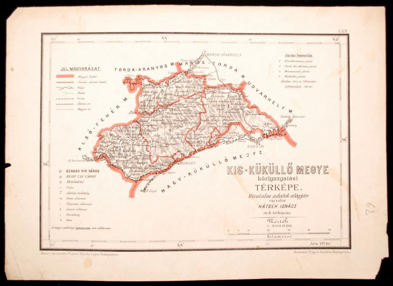 1880 Kis-Küküllő megye közigazgatási térképe. Hátsek Ignác - A magyar szent korona országainak megyei térképei. Rajzolta Hátsek Ignácz. Budapest, 1880. Rautmann Frigyes Kiadó Hivatala Posner Károly Lajos. Határszínezett kőnyomat,kis hibával a széleken, 27x38cm
