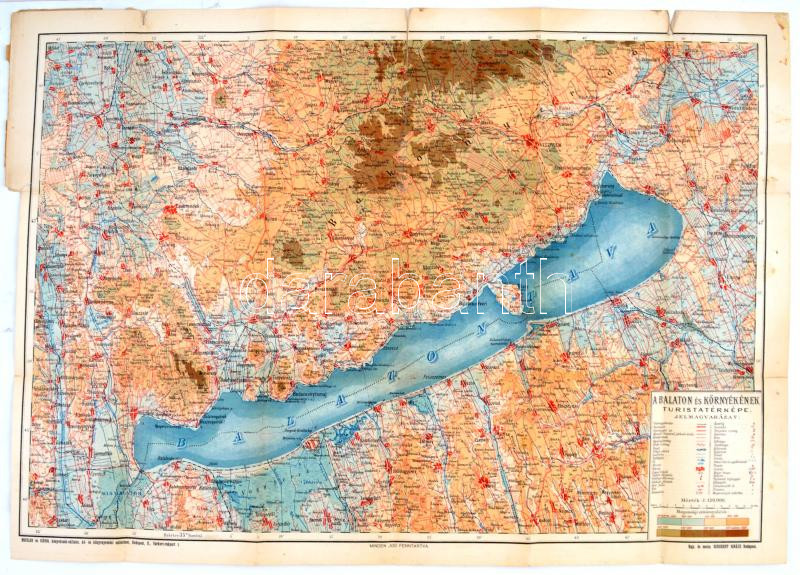 cca 1910 A Balaton és környékének lithografált turistatérképe, jelmagyarázattal, 1:150000, Heisler és Kózol Könyvkiadóvállalat, szakadásokkal, 51x70 cm
