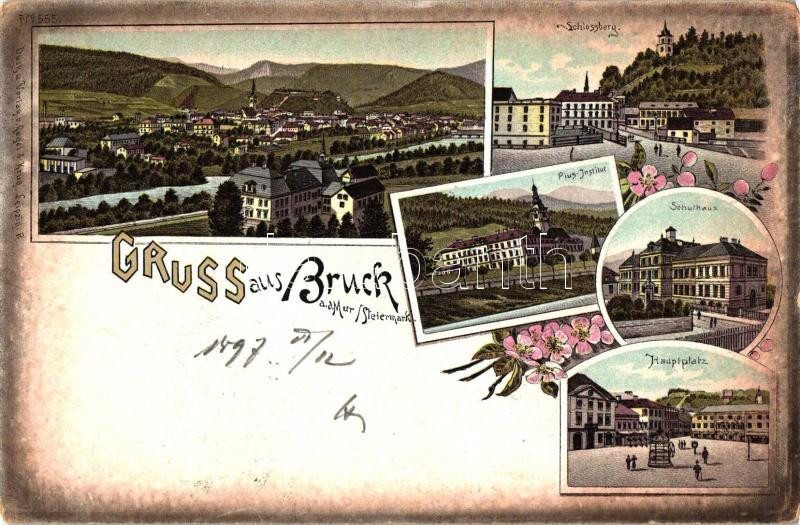 Leírás: 1897 Bruck an der Mur, Schlossberg, Pius Institut, Schulhaus, Hauptplatz / castle hill, school, main square, floral, litho (EK)