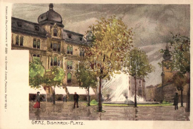 Leírás: Graz, Bismarck Platz; Ottmar Zieher Künstler-Heliocolorkarte No. 2891. unsigned Raoul Frank