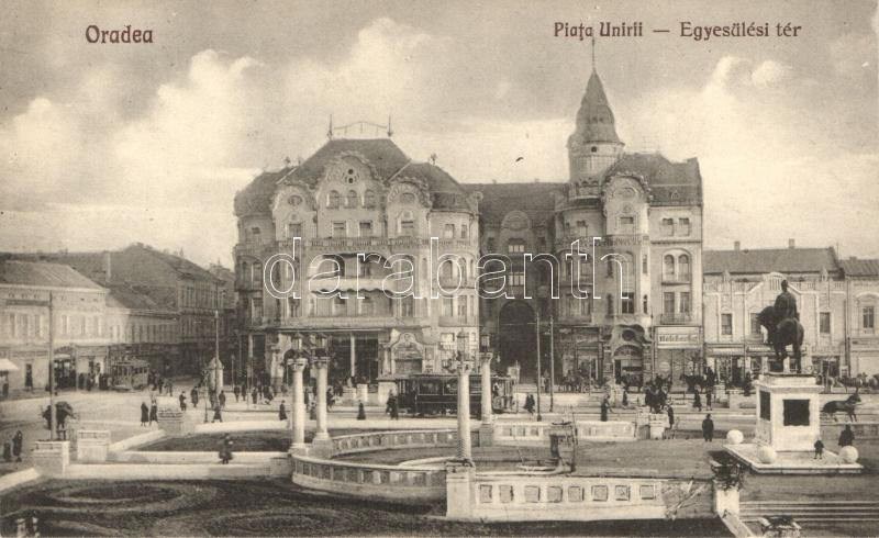 Leírás: Nagyvárad, Egyesülési tér, Piata Unirii. Mozi, gyógyszertár / Square, hotel, pharmacy, cinema