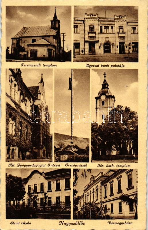 Nagyszőlős, Nagyszőllős, Vinohragyiv; Ugocsai bank, Gyógypedagógiai Intézet, Országzászló, Vármegyeháza, templomok / bank, institute, National flag, county hall, churches