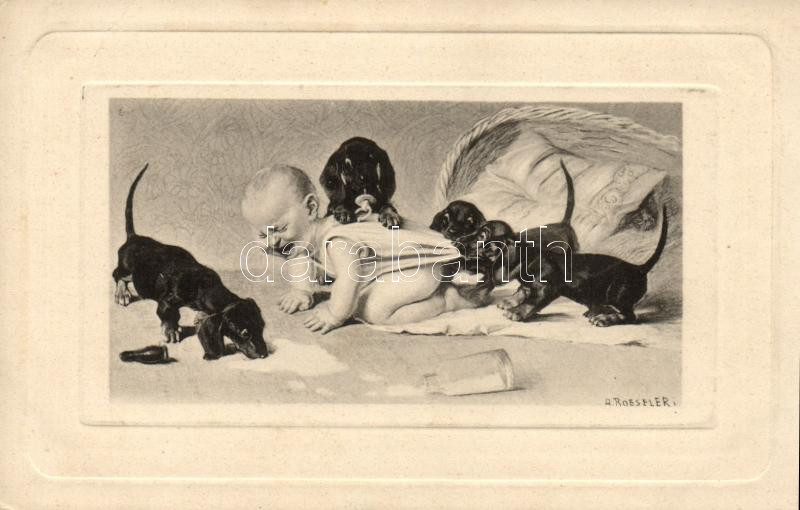 Leírás: Baby with Dachshund dogs, humour s: A. Roeseler