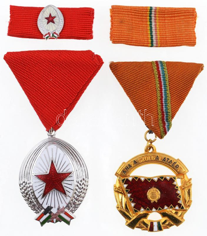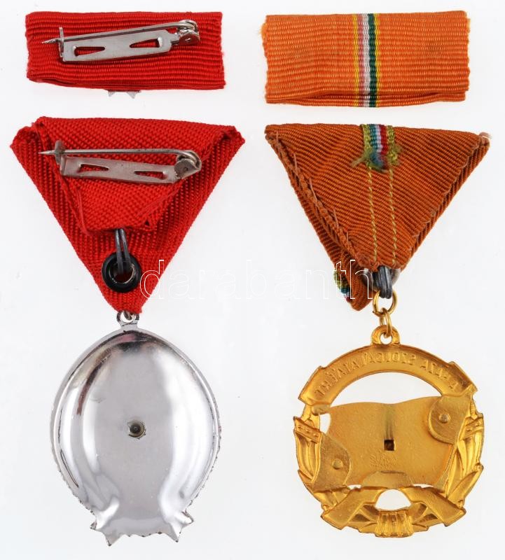 Leírás: ~1960-1970. "A Haza Szolgálatáért" arany fokozata, aranyozott zománcozott fém kitüntetés mellszalagon, szalagsávval + 1985. "Munka Érdemrend" ezüst fokozata, ezüstözött és zománcozott Br kitüntetés mellszalagon, miniatűrrel szalagsávon T:1-,2