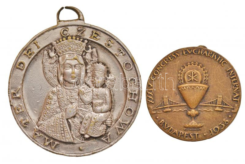 Leírás: Vegyes: Madarassy Walter (1909-1994) 1938. "XXXIV. Nemzetközi Eucharisztikus Kongresszus Budapest" fém jelvény, hátoldalán "TÖRV. VÉD. LUDVIG BP." jelzéssel (22,5mm) + Lengyelország DN "II. János Pál / Czestochowai Szűzanya" ezüstözött Br medál (32mm) T:2
