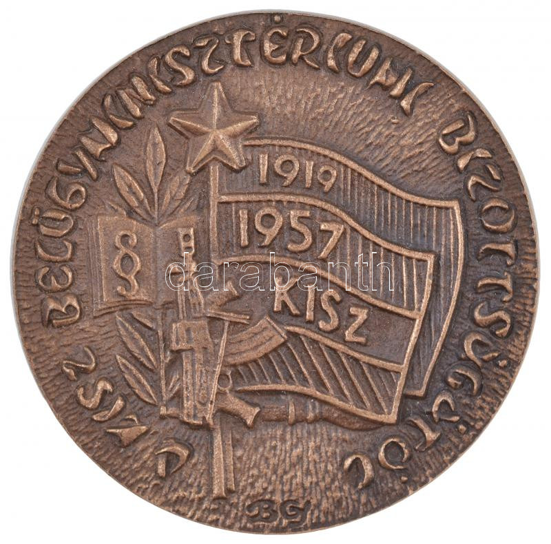 Leírás: ~1960-1970. "A KISZ Belügyminisztériumi Bizottságától 1919-1957" egyoldalas Br érem. Szign.: BGY (76mm) T:2