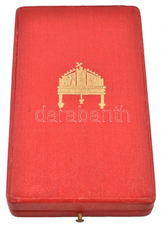 1935-1945. "A Magyar Érdemkereszt IV. osztálya - A Magyar Érdemrend lovagkeresztje" zománcozott kitüntetés zöld mellszalagon, adományozói dísztokban + "A Magyar Érdemkereszt III. osztálya - A Magyar Érdemrend tisztikeresztje" MINIATŰR jelvény, hátoldalán javítási nyom T:2 kopott aranyozás