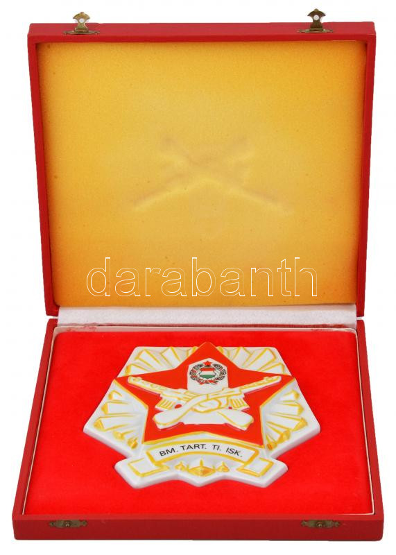 Leírás: ~1970. "BM Tartalékos Tisztképző Iskola" jelzett hollóházi porcelán emlékplakett eredeti dísztokban (158x150mm) T:1-