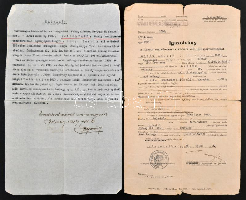 Budapest 1928. "Károly - Csapatkereszt" viselésére jogosító igazolvány... https://www.darabanth.com/hu/254-Gyorsarveres/254.0/Numizmatika/Militaria~17/Budapest-1928-Karoly--Csapatkereszt-viselesere-jogosito-igazolvany-belyeggel-belyegzes~II1237793