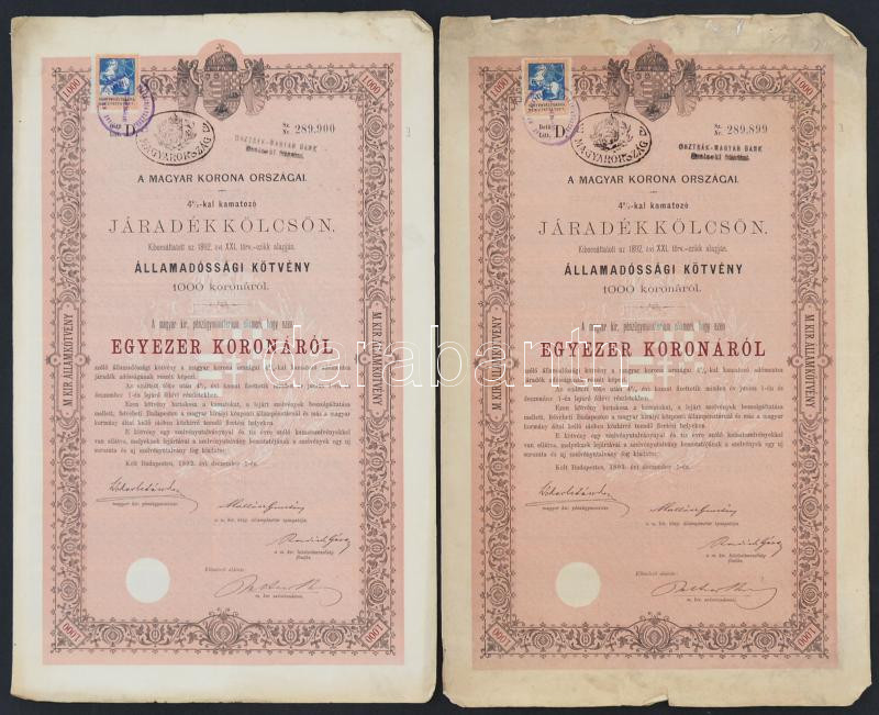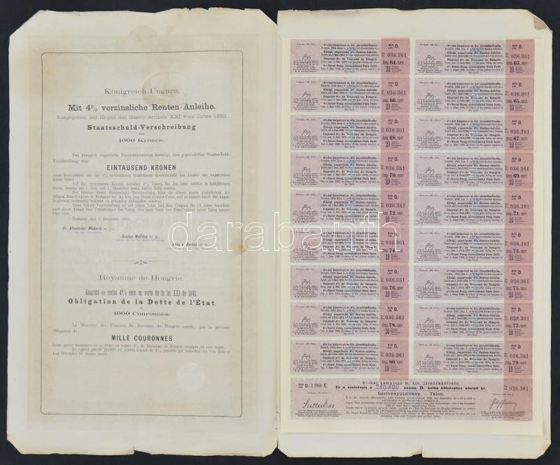 Leírás: 1892. "Magyar Korona Országai 4%-kal kamatozó Járadékkölcsön" államadóssági kötvénye 1000K-ról szelvényekkel (2x) sorszámkövetők T:III