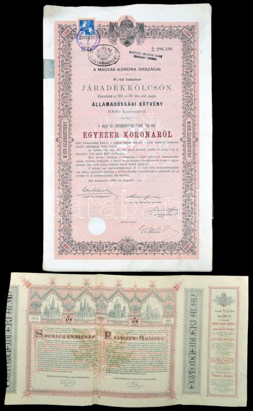 Leírás: Budapest 1886. "Egyházi Műemlék Alap" Sorsjegykölcsöne 5Ft-ról a budapest-lipótvárosi bazilika kiépítésére s egyházi műemlékek fenntartására + 1892. "Magyar Korona Országai 4%-kal kamatozó Járadékkölcsön" államadóssági kötvénye 1000K-ról szelvényekkel T:III