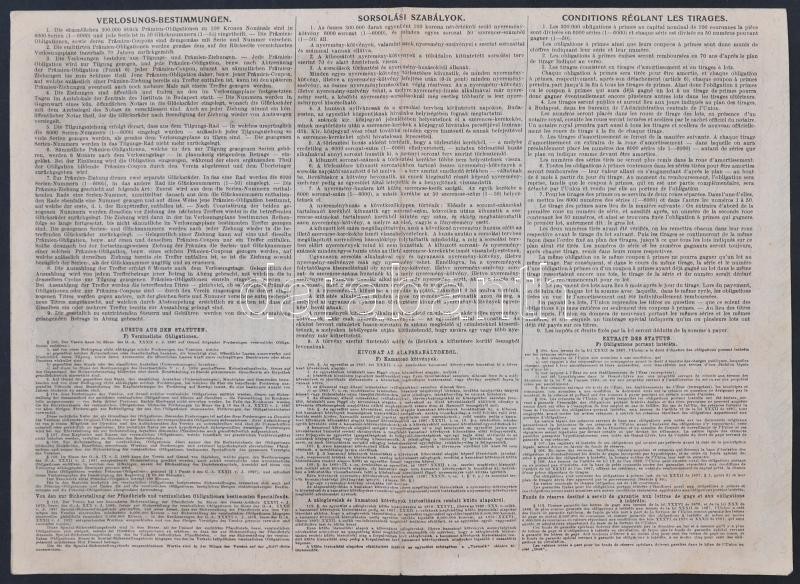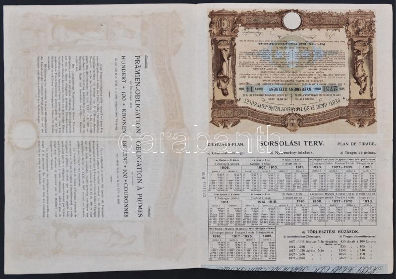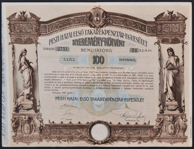 Leírás: Budapest 1906. "Pesti Hazai Első Takarékpénztár-Egyesület" nyeremény-kötvénye 100K-ról, szárazpecséttel T:II-