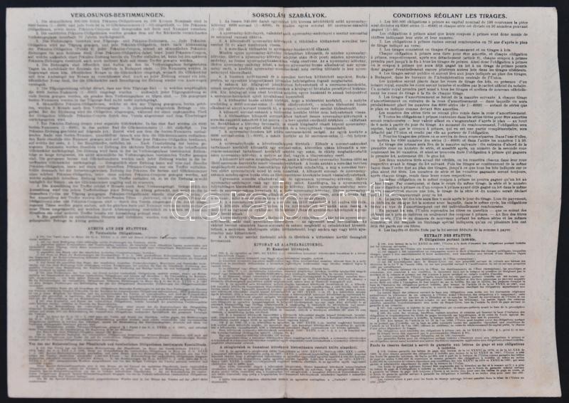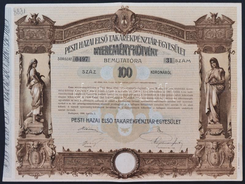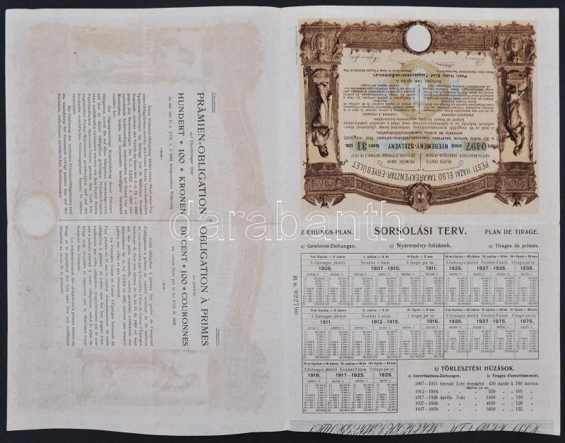 Leírás: Budapest 1906. "Pesti Hazai Első Takarékpénztár-Egyesület" nyeremény-kötvénye 100K-ról, szárazpecséttel T:III