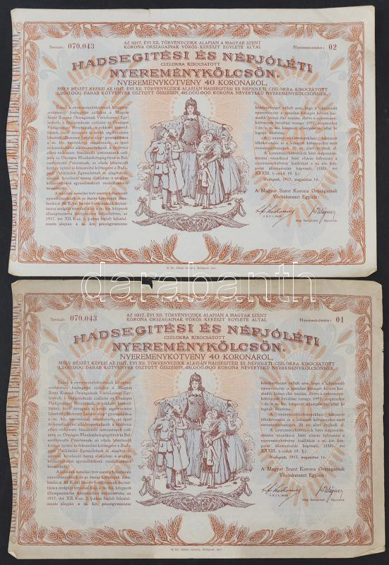 Leírás: Budapest 1917. "Hadsegítési és Népjóléti nyereménykölcsön" nyereménykötvény 40K-ról, szárazpecséttel (2x) sorszámkövetők, felülbélyegzéssel T:II,II-