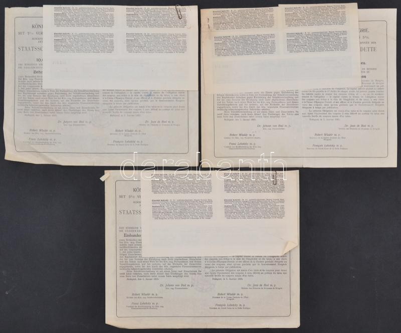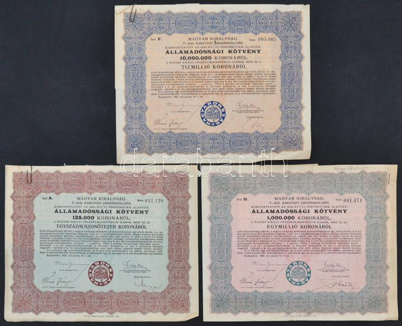 Leírás: Budapest 1925. "Magyar Királyság 5%-kal kamatozó Járadékkölcsön Államadóssági Kötvény" 125.000K, 1.000.000K, 10.000.000K-ról szelvényekkel T:III