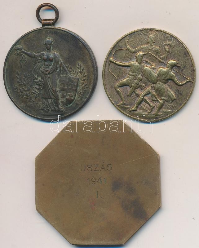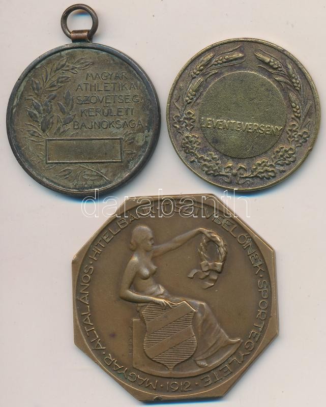 Leírás: Zombori Kiss István (1902-1953) 1941. "Magyar Általános Hitelbank Tisztviselőinek Sportegylete 1912 / Úszás 1941. I" Br díjérem (46mm) + DN "Leventeverseny" aranyozott Br díjérem (35mm) + "Magyar Athletikai Szövetség Kerületi Bajnoksága" fém sportérem füllel (35mm) + Belgium 1934. 100Fr-20B + 1964. 20Fr T:2,2-,restaurált