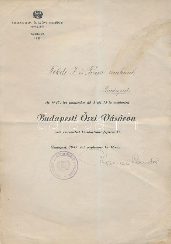 1947 Rónai Sándor(1892-1965) a Magyar Népköztársaság Elnöki Tanácsa el... https://www.darabanth.com/hu/255-Gyorsarveres/255.0/Festmeny-mutargy-papirregiseg-egyeb/Alairas~600017/1947-Ronai-Sandor1892-1965-a-Magyar-Nepkoztarsasag-Elnoki-Tanacsa-elnokenek-sajatkezu-~II1244922