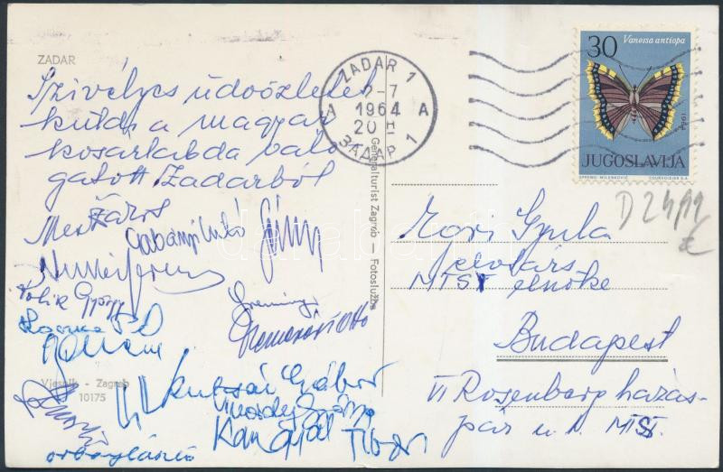 Leírás: 1964 Magyar Kosárlabda válogatott csapat aláírása, többek között:Kulcsár, Kangyal, Polik, Gabányi, és sokan mások