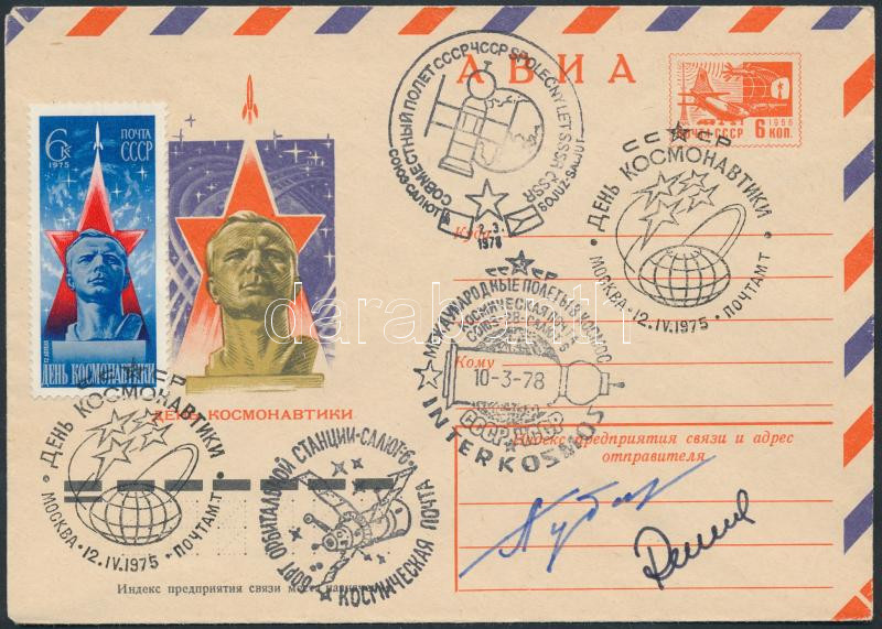 Leírás: Alekszej Gubarev (1931-2015) és Vladimír Remek (1948- ) orosz ill. cseh űrhajósok aláírásai emlékborítékon