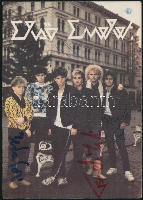 Leírás: Az Első Emelet könnyűzenei együttes csapattagjainak aláírása az őket ábrázoló képen