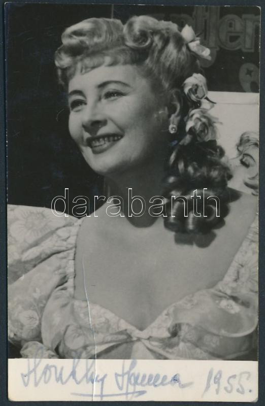 Honthy Hanna (1893-1978) Kossuth-díjas színművésznő, operettprimadonna, érdemes és kiváló művész aláírása egy a művésznőt ábrázoló fotón, apró hibával, 8x5cm
