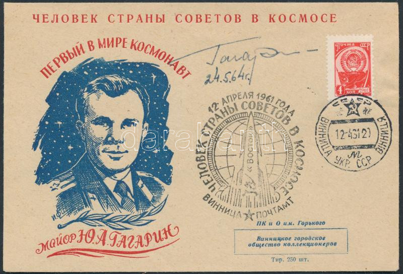 Leírás: Jurij Alekszejevics Gagarin (1934-1968) aláírása őt magát ábrázoló borítékon