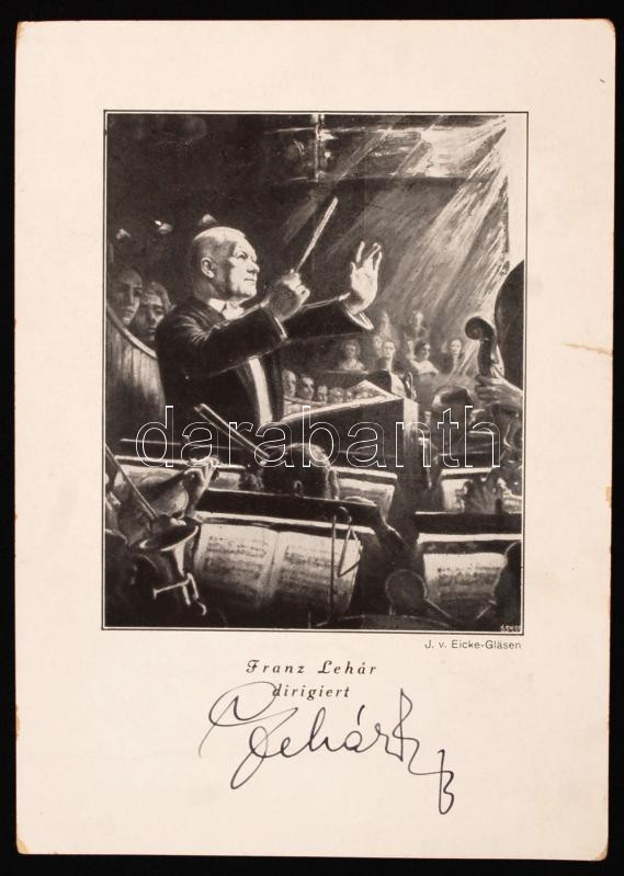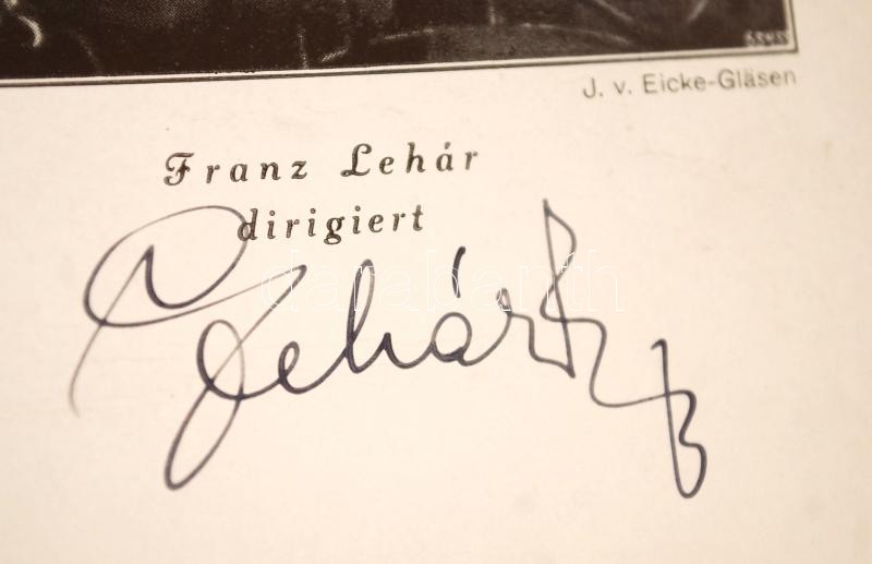Leírás: Lehár Ferenc (1870-1948) zeneszerző, operettkomponista, karmester saját kezű aláírása egy a művész ábrázoló fotólapon, 15x10cm