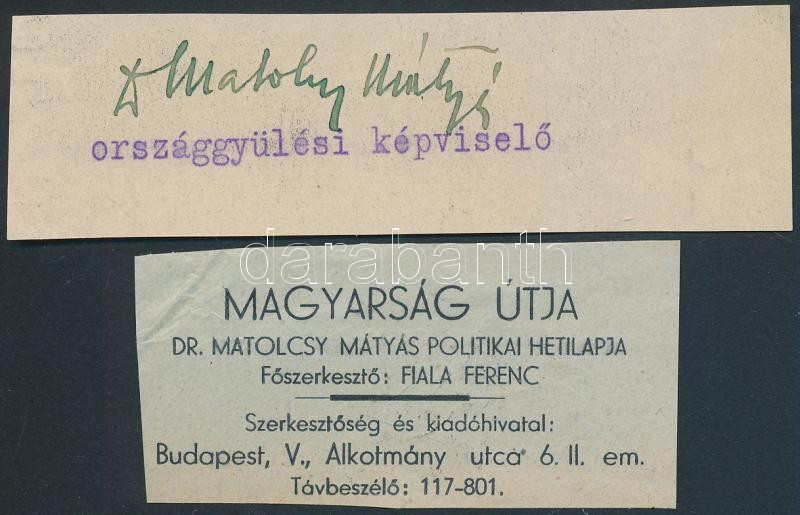 Leírás: Matolcsy Mátyás (1905-1953) országgyűlési képviselő, agrárközgazdász, szélsőjobboldali politikus aláírása kivágáson