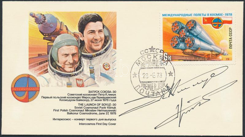 Leírás: Pjotr Iljics Klimuk (1942- ) és Mirosław Hermaszewki (1941- ) szovjet ill. lengyel űrhajósok aláírásai Szojuz 30-emlékborítékon