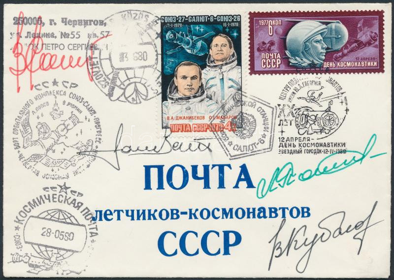 Valerij Kubaszov (1935-2014), Farkas Bertalan (1949- ) orosz ill. magyar űrhajósok és másik két kozmonauta aláírása emlékborítékon, különféle bélyegzésekkel