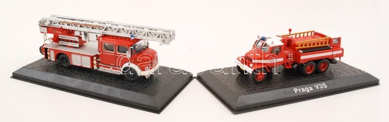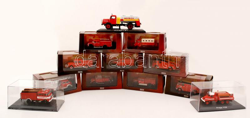 Leírás: 12 db Atlas Editions tűzoltóautó modell, műanyag tokban (egy tok nálkül), festett műanyag, h:12-24 cm