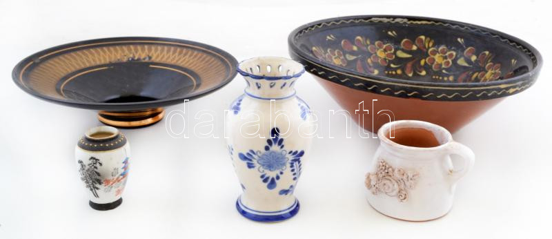 Leírás: Vegyes kerámia-porcelán-üveg tétel: 2 db rál, kis porcelán és kerámia mini vázák, d: 23 és 27 cm, m: 6, 7 és 13 cm