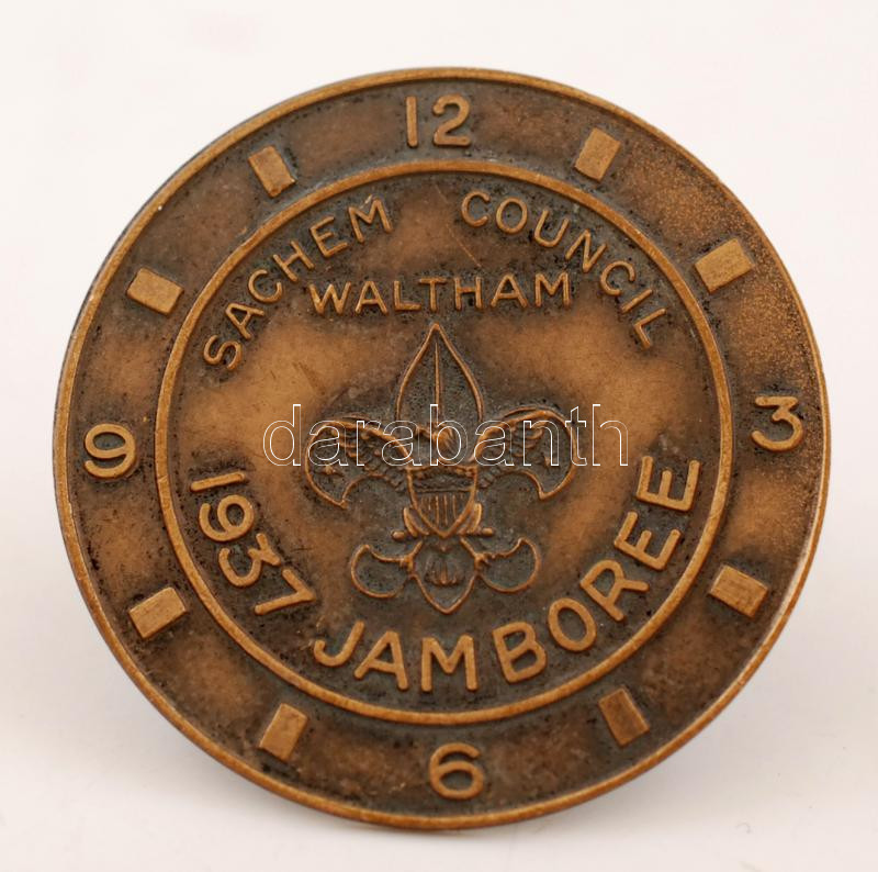 "Sachem Council Waltham, 1937 Jamboree" feliratú fém cserkész nyakkend... https://www.darabanth.com/hu/255-Gyorsarveres/255.0/Festmeny-mutargy-papirregiseg-egyeb/Cserkesz~600026/Sachem-Council-Waltham-1937-Jamboree-feliratu-fem-cserkesz-nyakkendofogo-d-4-cm~II1242938