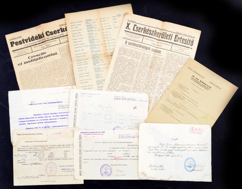 cca 1930-1940 Vegyes cserkész tétel: a MCsSz OK 11. sz. körlevele, különféle okmányok (nyugta, stb.), a 911. sz. Szent Imre cserkészcsapat tagjainak névsorának egy része, cserkészújságok
