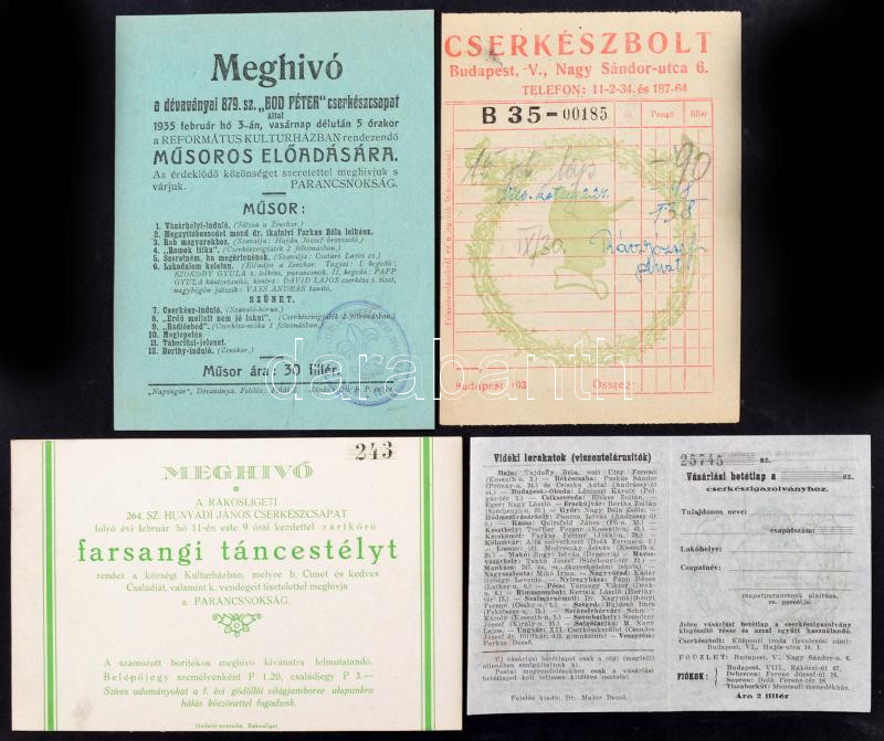 Leírás: cca 1930 Különféle cserkészokmány és -nyomtatvány: meghívók, vásárlási betétlap, nyugta, összesen 4 db