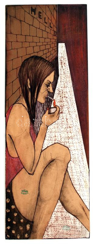 Leírás: Hornyánszky hagyatéki pecséttel, cigarettázó, kollázs- vegyes technika, hugarocell, 50×20 cm