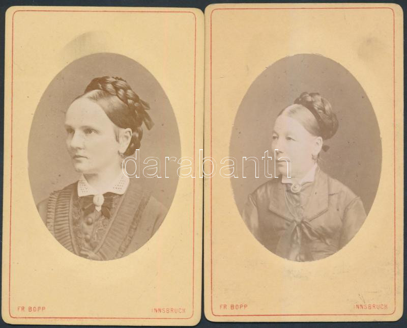 Leírás: 1870-1900 Női portrék, keményhátú kabinetfotók F. Bopp innsbrucki műterméből,2db, cca 11x6cm