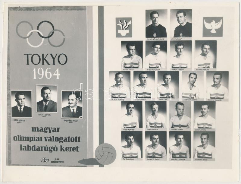 1964 Tokió, A magyar olimpiai válogatott labdarúgó keret, kistabló 22 ... https://www.darabanth.com/hu/255-Gyorsarveres/255.0/Festmeny-mutargy-papirregiseg-egyeb/Foto~600018/1964-Tokio-A-magyar-olimpiai-valogatott-labdarugo-keret-kistablo-22-nevesitett-portreval-1~II1239382