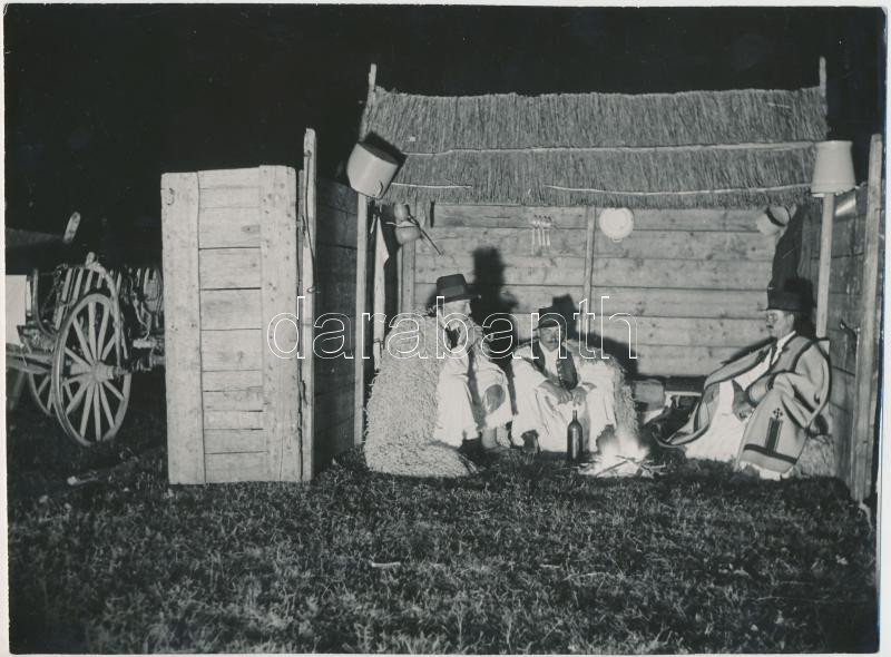 Leírás: cca 1930 Kerny István (1879-1963): Bugaci pásztorok esti pihenője, pecséttel jelzett, vintage fotóművészeti alkotás, 22,5x17 cm