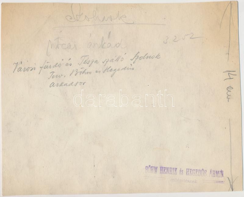 Leírás: cca 1930 Szolnok, Utcás árkád a városi fürdő és Tisza szálló épületében, feliratozott fotó, sarkán törésvonal, 15,5x19 cm