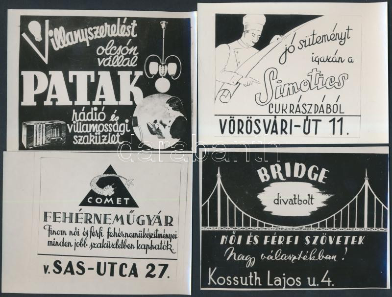 cca 1940 Fekete György (1904-1990) budapesti fényképész reklám grafikái különféle szolgáltatásokról, termékekről, ezekből készített a mozikban vetíthető diapozitív üveglemez képeket, az eladásra kínált tétel 13 db papír pozitív képet tartalmaz, melyek későbbi nagyítások a hagyatékában talált negatívokról, 9x12 cm