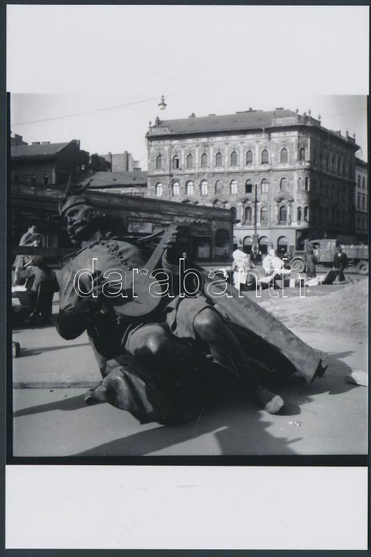 cca 1955 Tinódi Lantos Sebestyén szobra - amely eredetileg a Nemzeti Színház előtt, a Blaha Lujza téren állt, elszállításra vár, korabeli negatívról készült modern nagyítás, 10x15 cm-es fotópapírra