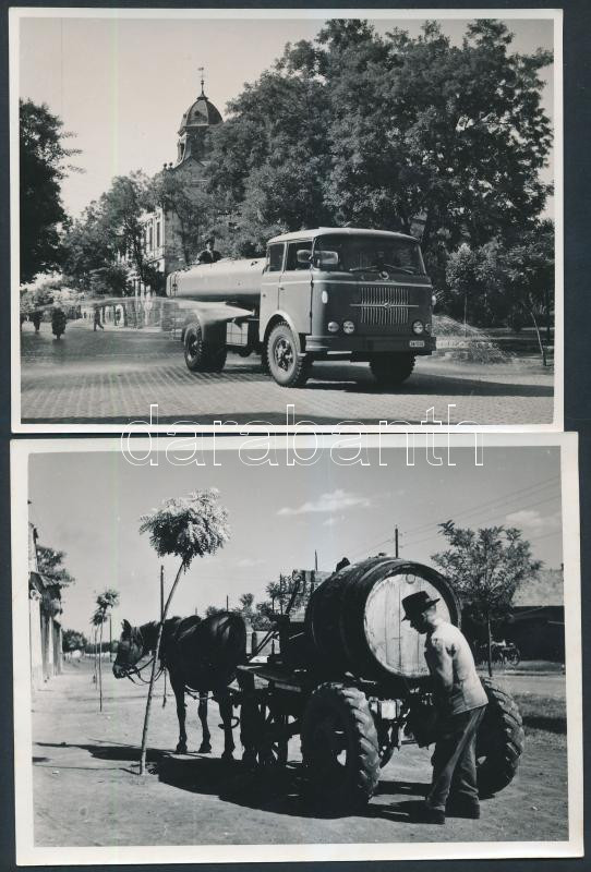 cca 1960 Medgyesi László: Kecskeméti vízművek, a lajtos kocsi házról-házra járt, 2 db vintage fotó a szerző hagyatékából, az egyik feliratozva, 9x12 cm
