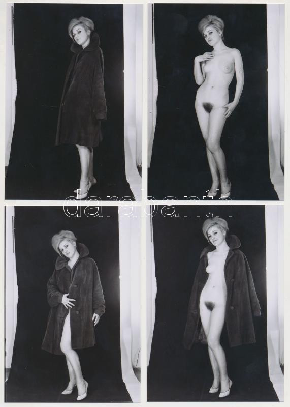 Leírás: cca 1970 Nagy bundában kis bunda, 7 db finoman erotikus fénykép, 13x9 cm /