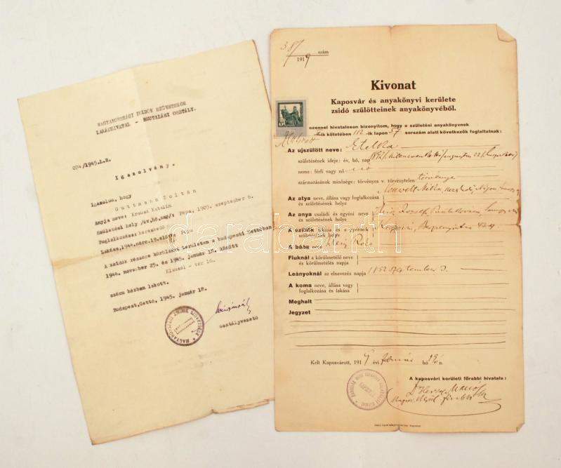 1919, 1945 2 db régi okmány: kivonat a Kaposvár és anyakönyvi kerülete zsidó szülötteinek anyakönyvéből; a Magyarországi Zsidók Szövetsége Lakáshivatal Beutalási Osztály által kiállított igazolvány