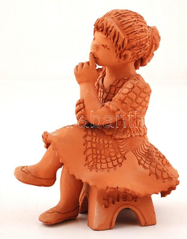 Leírás: Illár Erzsébet (1940- ): Ülő kislányka. Égetett agyag, jelzett, jó állapotban, m:16 cm
